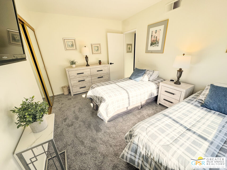 DESIRABLE ST. ANDREW'S PRICED TO SELL. The last six St. Andrew's models sold for $468,000 or more. The location is ideal east-facing for morning sun, across the street from the pool and on a road less travelled a cul-de-sac. Its interior is clean and spacious, with fresh paint throughout. Also rare: it has a DINING ROOM. Modern kitchen with well-appointed cabinets and stove and fridge new in the last year. Intelligent floor plan with the owner's suite and bath on one side, the guest bedroom and bath on the other with updated furnishings. There's also A DEN with a new sofa bed that could easily be a third bedroom. Spacious primary bedroom has a walk-in closet, locked-off owner's closet and slider to tiled patio. Light, bright and airy as you enter, this exceptional unit includes a large 2-car GARAGE with in-wall A/C unit, retractable awnings, and extended back patio with stunning views from the 2nd fairway. Turnkey furnished. This residence has an impressive rental history, even in summer, or it can be enjoyed as a family home. Palm Desert Resort CC features 18-hole championship golf course, newly renovated clubhouse, 20 pools and spas, and the Coachella Valley's premiere pickleball and tennis club!