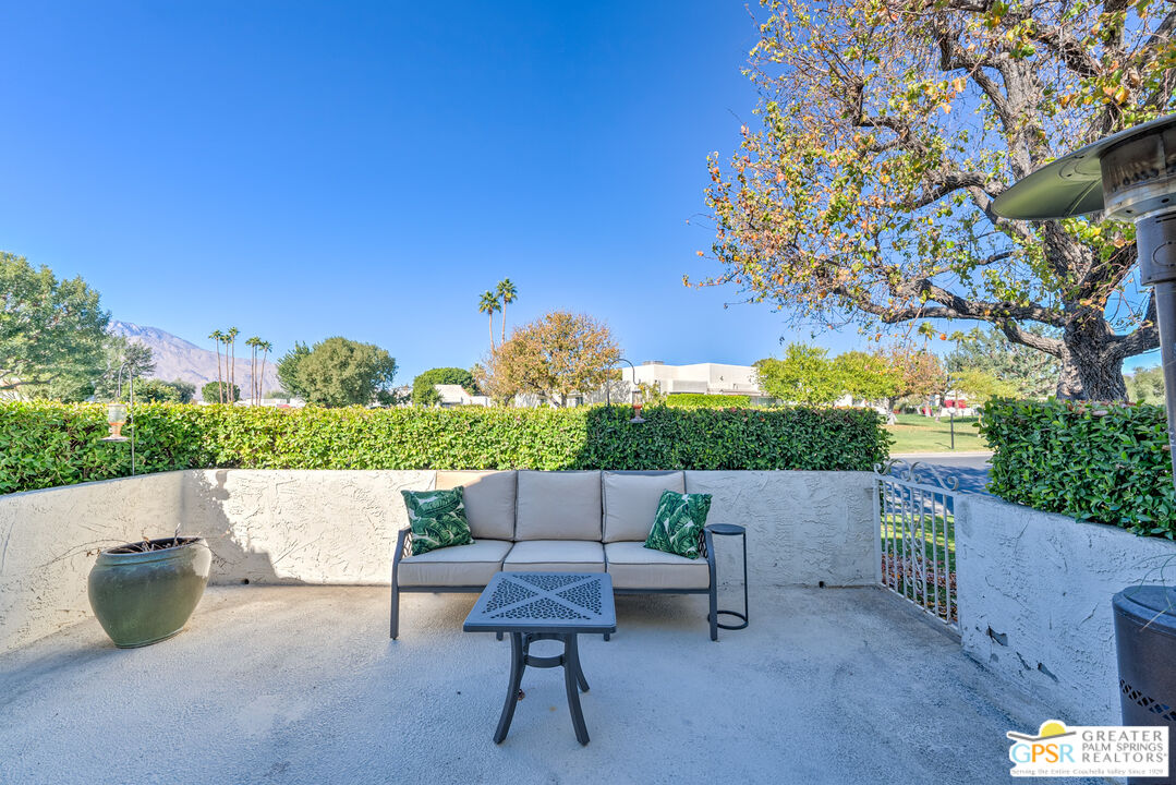 This beautifully maintained one bedroom, one bathroom condo comes turnkey furnished and ready to move-in. A small formal entry welcomes you before joining the open floor plan with soaring ceilings in the living room and dining area. The kitchen enjoys a panoramic view in the large adjoining corner windows and includes ample counter space, dual-basin sink, gas cooktop and stainless steel appliances. The orientation provides boundless light and mountain views from almost every window. In true Palm Springs fashion, the indoors extend outdoors to the large patio off the living room. The stucco wall and lush hedges provide privacy while maintaining direct mountain views. The primary bedroom includes a large walk-in closet, an ensuite bathroom with dual sink vanity, enclosed water closet/commode and spacious tiled walk-in shower. A second patio located off the bedroom includes a retractable awning and privacy hedges. Also included, a one-car carport and one-car garage with full-size washer & dryer, stationary tub sink and storage cabinets. The Fairways community offers 8 pools and spa, 3 lighted tennis courts, basketball, putting green, bocce, bbq area, clubhouse and THE BEST PICKLEBALL courts in all of Palm Springs! Rentals for 30+ day minimum are allowed. HOA maintains: trash & recycle, roof, all amenities & pools, all common grounds, landscaping and the main access gates. Offered turnkey furnished! Windows and sliders are dual-pane. Seller paid lease "extension" fee/assessment.