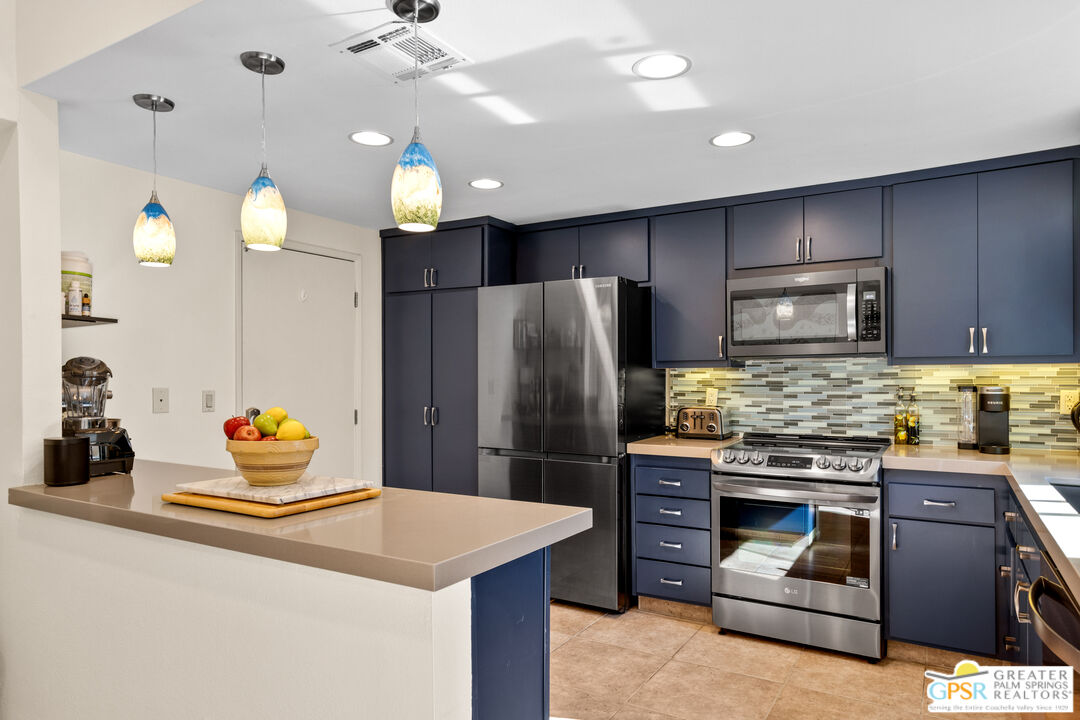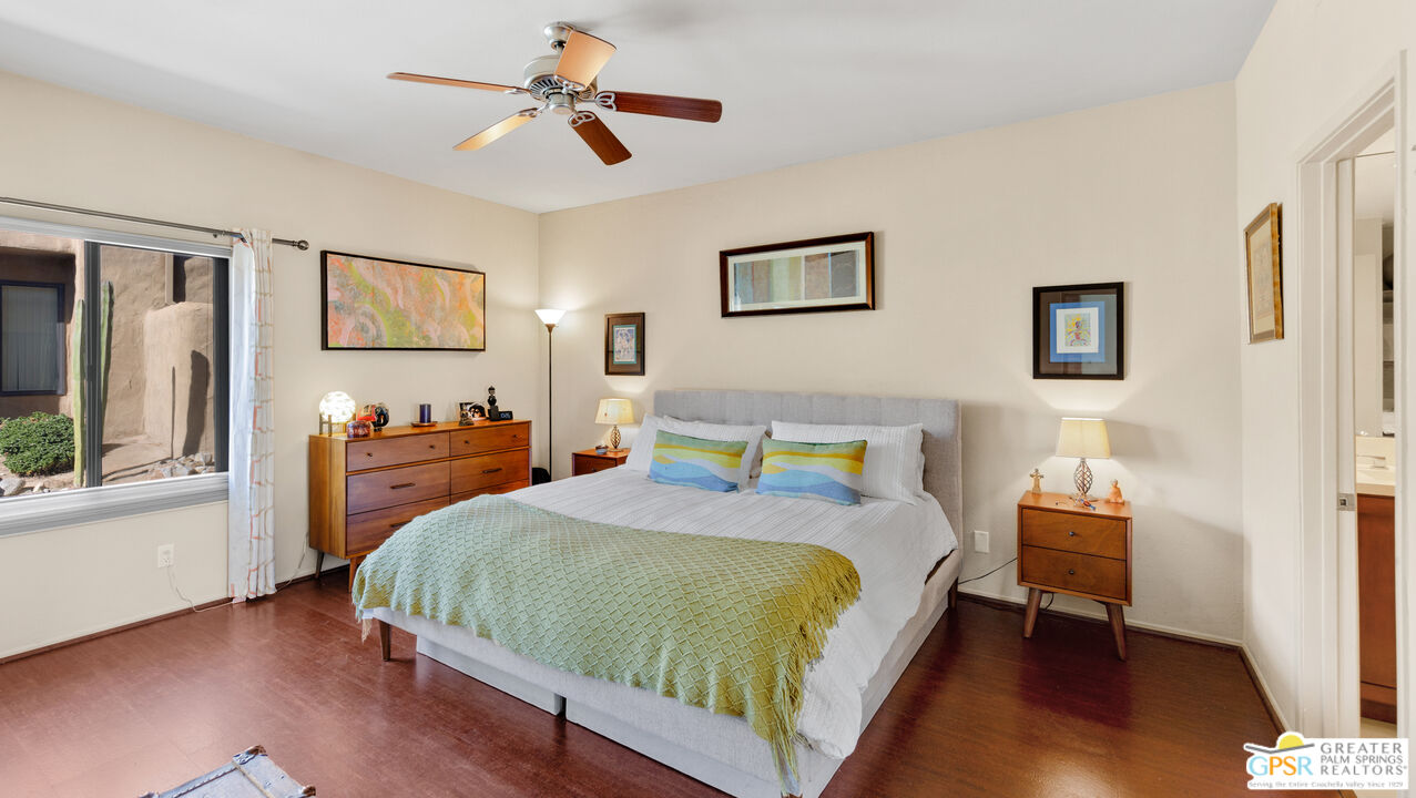 It's here -- your South Palm Springs 2BR + 2BA + 2 private patios + attached 2-car garage mountain view home. Nestled within the lushly landscaped and highly sought-after Waverly Park community, this two-story desert retreat on FEE land (you own), offers undeniable indoor/outdoor living, versatility, and charm. Entering your new home is a delight with the open and bright living concept. The living room showcases a stacked stone fireplace, dining area complete with bar, and recently updated kitchen -- all flow seamlessly onto a spacious, ultra-private outdoor patio accented by a wall of mature Orange Jasmine. With two spacious en-suite primary bedrooms, one upstairs and one downstairs, you'll enjoy added convenience and privacy. Downstairs, the en-suite bathroom features dual vanities with a striking walk-in shower, glass tile, upscale fixtures, lighting, and countertops. Upstairs, the en-suite primary bedroom features a walk-in closet, western mountain views, and 2 new Mitsubishi split AC units. The en-suite bath also offers a tiled walk-in shower, high-end fixtures, countertop, and lighting. Need some sun or want to stargaze? Just stroll outside to your spacious open-air patio complete with new pergola and captivating southern and southwestern mountain views. Waverly Park amenities include 3 pools and spas, tennis and pickleball courts, and gated access. HOA fees include water, trash, roof maintenance, and common area landscaping.